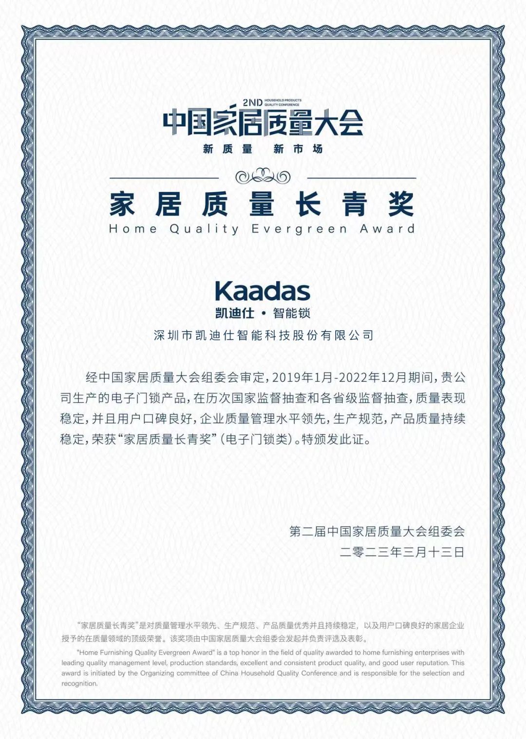 近日(ri),第二屆中(zhong)國(guo)傢(jia)居質(zhi)量大(da)會在(zai)佛山(shān)希爾頓酒店(diàn)盛(sheng)大(da)召開,Kaadas凱迪仕受邀出席盛(sheng)會,與各大(da)參會代(dai)表一(yi)起,爲(wei)共築傢(jia)居市(shi)場(chang)高(gao)質(zhi)量生(sheng)态建(jian)言獻策。期間,2022年(nian)度沸騰質(zhi)量獎頒獎盛(sheng)典隆重(zhong)舉行,Kaadas凱迪仕連續4年(nian)獲獎,一(yi)舉包攬“傢(jia)居質(zhi)量長(zhang)青獎”與“沸騰質(zhi)量金獎”兩項(xiang)重(zhong)磅榮譽。