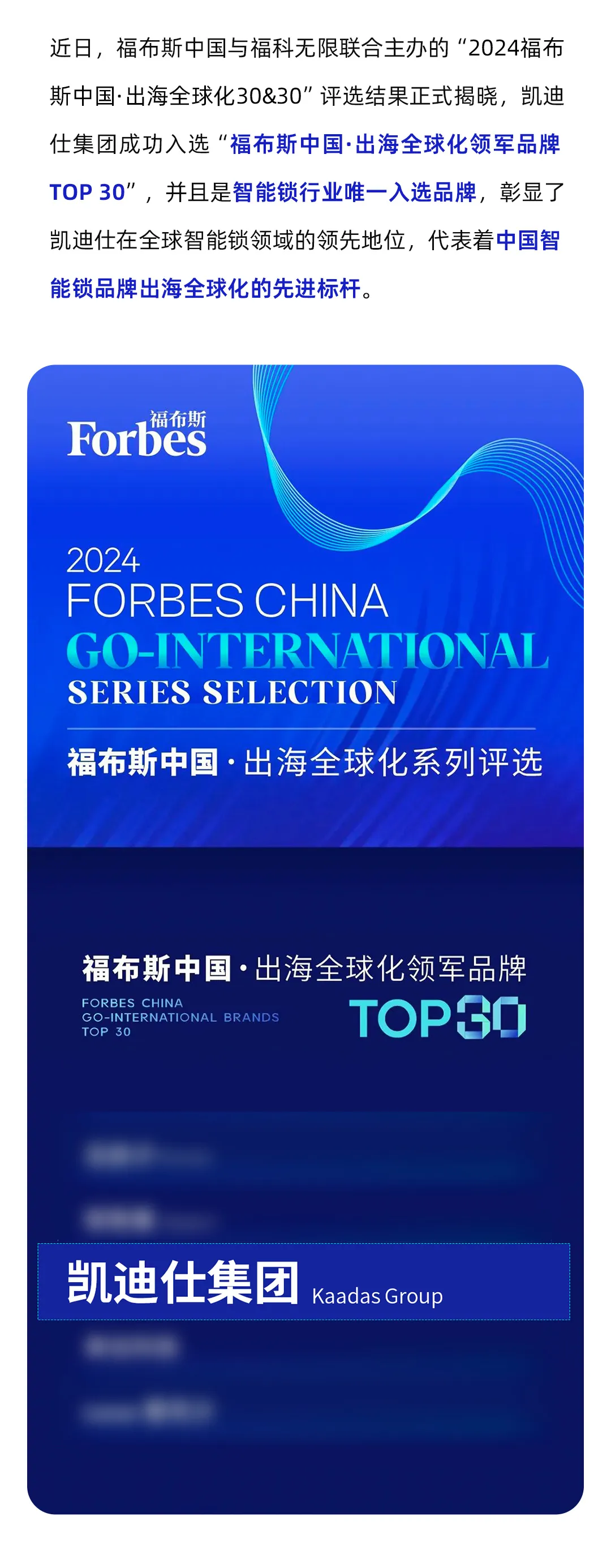智能(néng)鎖全球典範!凱迪仕榮膺2024福布斯中(zhong)國(guo)·出海全球化領(ling)軍品(pin)牌TOP30