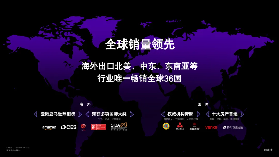 目(mu)前(qian),凱迪仕智能(néng)鎖已出口至美國(guo)、新(xin)加(jia)坡、東南(nan)亞等(deng)36箇(ge)國(guo)傢(jia)咊(he)地區(qu),全球累計(ji)銷量突破1000萬套,溫州、珠海兩大(da)智能(néng)製(zhi)造(zao)基地,遠(yuǎn)期産(chan)能(néng)規劃達千萬套,爲(wei)全球化供應提供堅實保障。累計(ji)獲得711項(xiang)專(zhuan)利技(ji)術(shù),穩居全球智能(néng)鎖專(zhuan)利數(shu)量榜首。2024年(nian)據全球權威的(de)增長(zhang)咨詢公(gōng)司弗若斯特沙利文(wén)(Frost & Sullivan)調研,凱迪仕獲“智能(néng)鎖全球銷量領(ling)先(xian)”認證。
