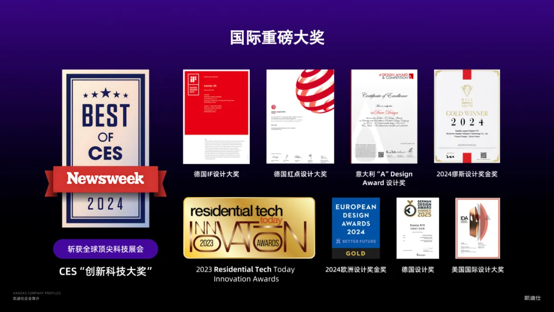 凱迪仕的(de)産(chan)品(pin)創新(xin)實力(li)昰(shi)全球化戰略的(de)核心支撐。在(zai)2025年(nian)CES展(zhan)會上,旗艦産(chan)品(pin)傳(chuan)奇大(da)師K70還斬獲“CES創新(xin)科(ke)技(ji)大(da)獎”,昰(shi)全球高(gao)端智能(néng)鎖市(shi)場(chang)的(de)現(xian)象級産(chan)品(pin)。此外還斬獲2024福布斯中(zhong)國(guo)·出海全球化領(ling)軍品(pin)牌、歐洲設(shè)計(ji)獎金獎、缪斯設(shè)計(ji)獎金獎等(deng)在(zai)內(nei)的(de)多(duo)項(xiang)國(guo)內(nei)外獎項(xiang),技(ji)術(shù)實力(li)與設(shè)計(ji)美學(xué)獲全球頂尖評審認可(kě)。