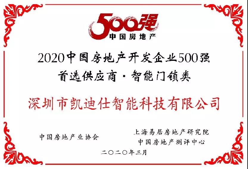 今日(ri),以(yi)“重(zhong)塑-遠(yuǎn)見-啓程(cheng)”爲(wei)主(zhu)題的(de)2020中(zhong)國(guo)房地産(chan)500強測(ce)評成(cheng)果髮(fa)布會暨500強高(gao)峰論壇于(yu)線(xiàn)上如期舉辦(bàn),Kaadas凱迪仕位居智能(néng)們(men)鎖類目(mu)榜單(dan)榜首,榮獲“2020中(zhong)國(guo)房地産(chan)開髮(fa)齊(qi)業500強首選供應商(shang)”殊榮。自2017年(nian)新(xin)增智能(néng)們(men)鎖測(ce)評類目(mu)至今,凱迪仕已連續四年(nian)獲得此項(xiang)榮譽。