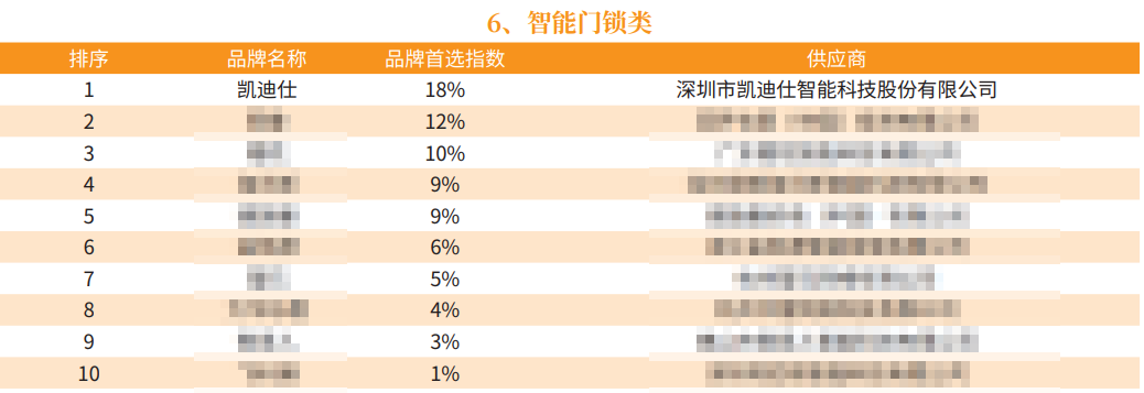 根據測(ce)評研究報告顯示,凱迪仕以(yi)18%的(de)品(pin)牌首選率,遠(yuǎn)超第二名(míng),牢牢占據智能(néng)們(men)鎖行業榜首,以(yi)非(fei)凡實力(li)造(zao)就連續7年(nian)入選的(de)奇績。