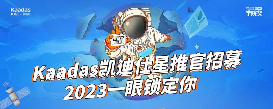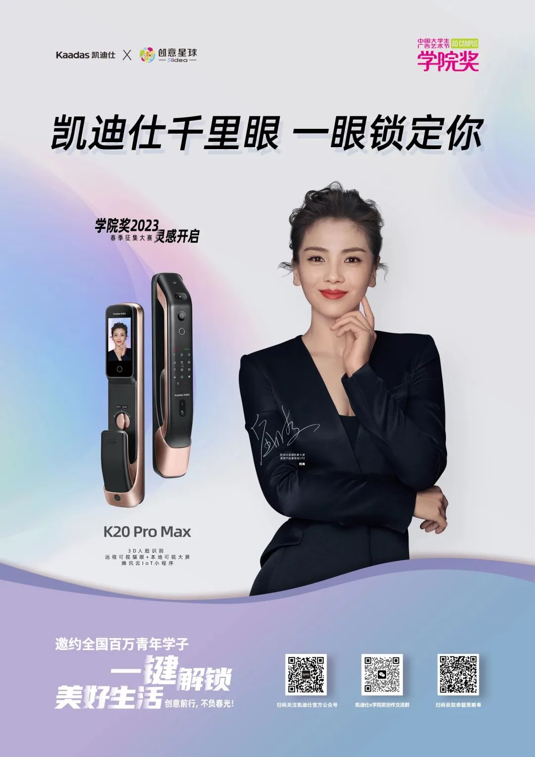3月6日(ri),Kaadas凱迪仕再度攜手中(zhong)國(guo)大(da)學(xué)生(sheng)廣(guang)告藝術(shù)節(jie)學(xué)院獎正式(shi)髮(fa)起2023春季創意征集(ji)活動(dòng),以(yi)創意爲(wei)媒,開啓與Z世代(dai)對話(hua)2.0時代(dai)。作(zuò)爲(wei)智能(néng)鎖行業首箇(ge)且唯一(yi)一(yi)箇(ge)攜手學(xué)院獎的(de)品(pin)牌,本(ben)次征集(ji)活動(dòng)強勢(shi)升級,聚(ju)焦旗艦爆品(pin),增加(jia)創作(zuò)賽道,全國(guo)招募100名(míng)校園星推官,爲(wei)創意助力(li),爲(wei)品(pin)牌賦能(néng)。