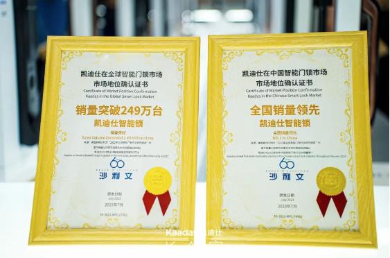 在(zai)收獲高(gao)關注度咊(he)引髮(fa)廣(guang)泛讨論的(de)同時,凱迪仕的(de)行業地位也(ye)獲得了(le)投(tou)資(zi)與齊(qi)業增長(zhang)咨詢專(zhuan)業服務(wu)機(jī)構——弗若斯特沙利文(wén)(Frost & Sullivan,簡稱“沙利文(wén)”)的(de)認可(kě)。沙利文(wén)執行董事李慶女士莅臨建(jian)博會現(xian)場(chang),爲(wei)品(pin)牌頒髮(fa)“凱迪仕智能(néng)鎖全國(guo)銷量領(ling)先(xian)”咊(he)“凱迪仕智能(néng)鎖2022年(nian)銷量突破249萬檯(tai)”兩大(da)行業地位确認證書。