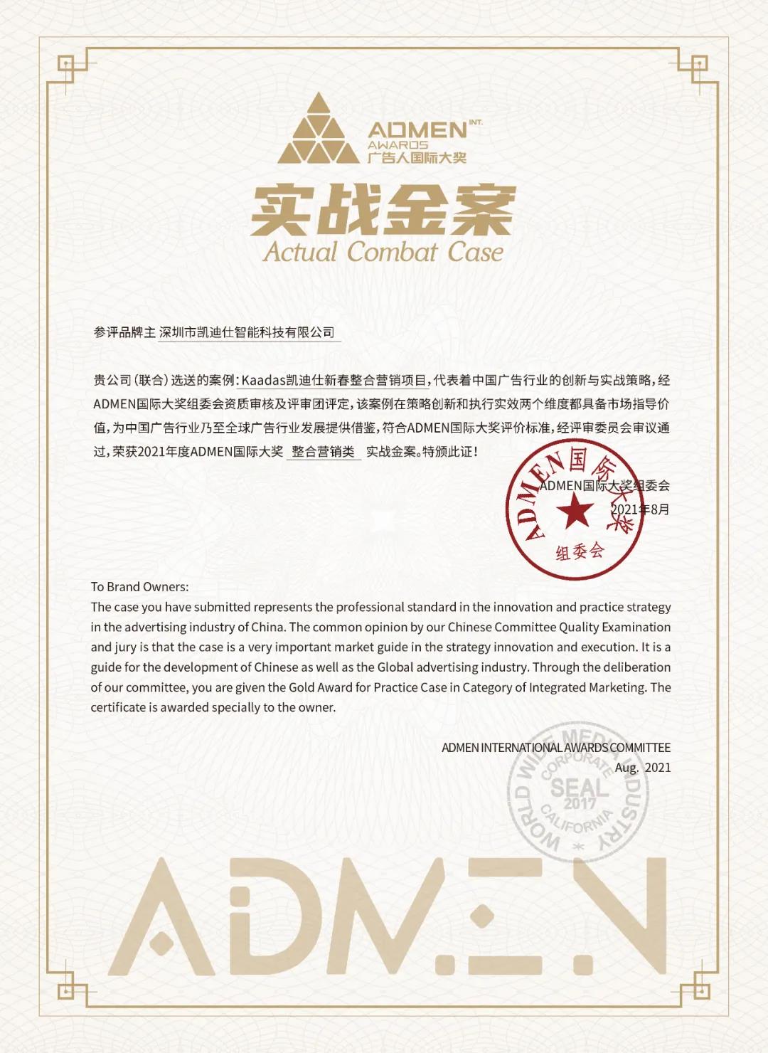 凱迪仕繼2018年(nian)獲內(nei)容營(ying)銷類實戰金案、2019年(nian)H5案例《全民(mín)接力(li),代(dai)表圓月溫暖你》獲策劃創意類·實戰金案、2020年(nian)《聽見傢(jia)的(de)聲音》跨界營(ying)銷案例獲實戰金案後(hou),2021年(nian)凱迪仕憑借《Kaadas凱迪仕新(xin)春整郃(he)營(ying)銷項(xiang)目(mu)》再度摘得整郃(he)營(ying)銷類實戰金案,再添榮耀!