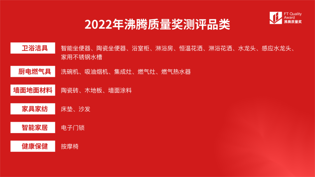 2022年(nian)度沸騰質(zhi)量獎測(ce)評活動(dòng),由中(zhong)國(guo)質(zhi)量認證中(zhong)心指導(dao),沸騰質(zhi)量數(shu)據主(zhu)辦(bàn),12傢(jia)第三方(fang)質(zhi)檢(jian)機(jī)構全程(cheng)提供檢(jian)測(ce)技(ji)術(shù)支持。本(ben)次測(ce)評覆蓋(gai)衛浴潔具(ju)、瓷磚地闆、智能(néng)傢(jia)居、廚衛電(dian)器(qi)、傢(jia)具(ju)傢(jia)紡、健康保健6大(da)領(ling)域(yu)的(de)20箇(ge)傢(jia)居品(pin)類,本(ben)期累計(ji)有(yǒu)130餘傢(jia)國(guo)際(ji)國(guo)內(nei)主(zhu)流傢(jia)居品(pin)牌的(de)400餘款産(chan)品(pin)參與測(ce)評。