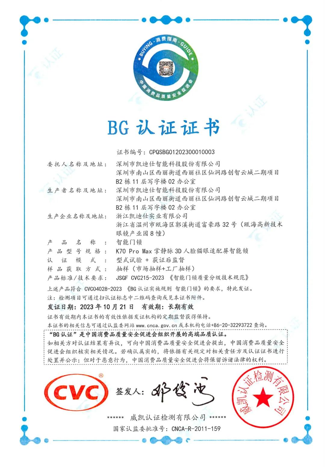 會議現(xian)場(chang)公(gōng)布了(le)首期智能(néng)們(men)鎖BG測(ce)評結果,凱迪仕從(cong)一(yi)衆品(pin)牌中(zhong)脫穎而出,K70“千裏眼”智能(néng)鎖通(tong)過(guo)專(zhuan)業機(jī)構的(de)層層檢(jian)測(ce),獲得首批(pi)BG認證證書。