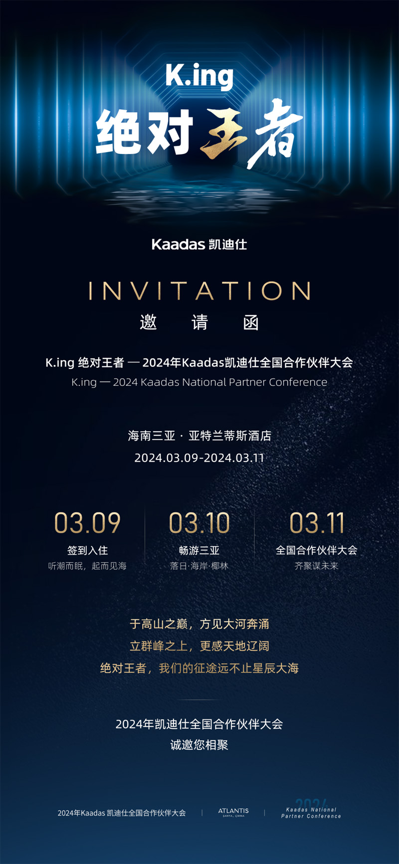 K.ing絕對王者——2024年(nian)Kaadas凱迪仕全國(guo)郃(he)作(zuò)夥伴大(da)會,3月三亞·亞特蘭蒂斯酒店(diàn),不見不散!